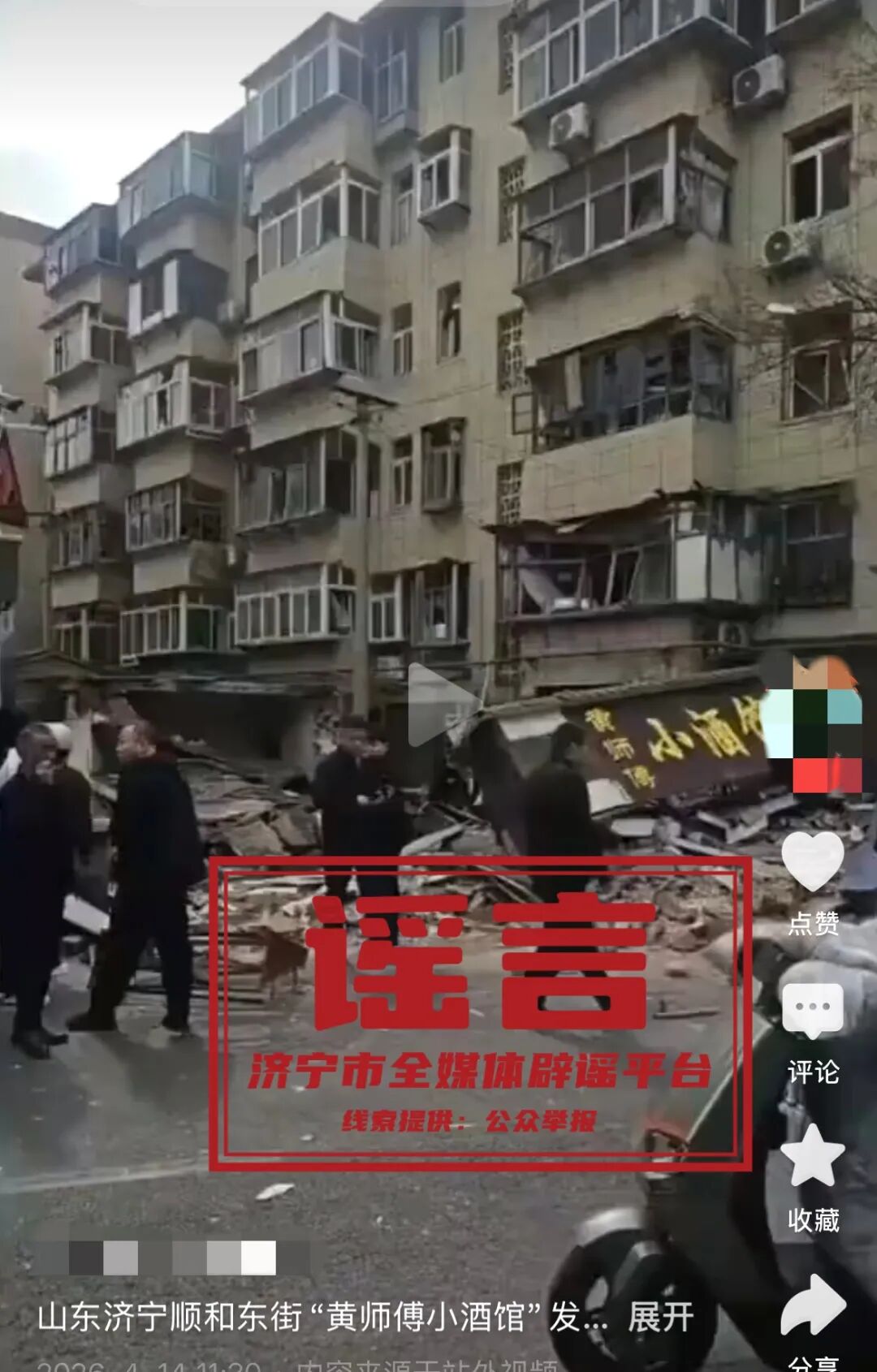 4月14日,有网民在网络平台发布一则短视频及现场图片,声称济宁市顺河东街“黄师傅小酒馆”发生火灾。