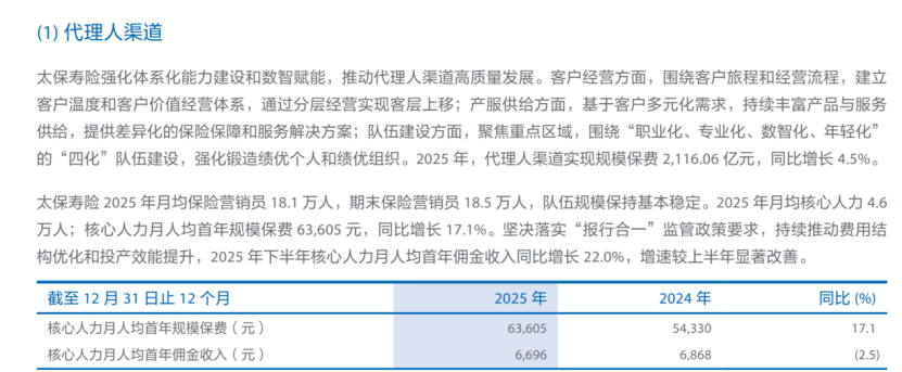 代理人队伍持续萎缩,行业规模差距显著。截至2025年末,中国太保代理人规模降至18.5万人,较2024年末减少约3000人,队伍规模持续缩水,同比下降1.6%。横向对比头部同业,同期中国人寿代理人规模达58.7万人,平安人寿代理人规模为35.1万人。