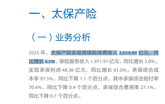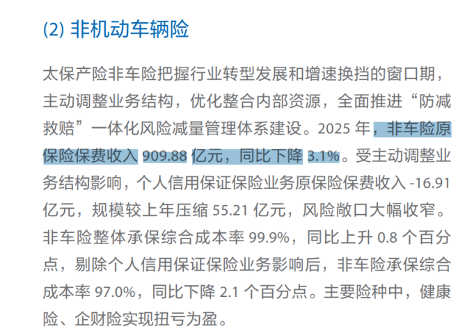 2025年,太保产险业务保费增长相对平缓,非车险业务规模及盈利指标呈现一定压力,业务结构仍处在优化调整过程中。