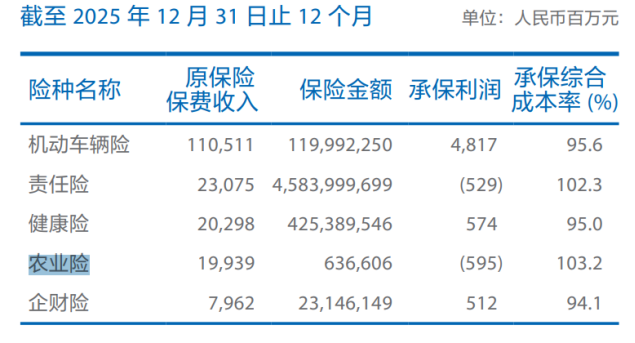 车险业务呈现规模回落、盈利承压态势。2025年,产险非车险原保险保费收入909.88亿元,同比下降3.1%,业务规模不增反降;非车险整体承保综合成本率99.9%,接近盈亏平衡线,责任险、农业险承保综合成本率高于100%。
