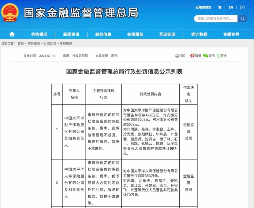 2025年7月11日,国家金融监督管理总局向中国太平洋保险(集团)股份有限公司开出一张总计1074万元的巨额罚单,其中25名相关责任人被合计罚款169万元。具体来看,太平洋产险因未按规定使用经批准的保险条款费率、投保信息管理不规范、数据报送不准确等违规行为,被处以552万元徽、河南分公司罚款);太平洋人寿则因同样问题叠加“给予投保人合同外利益”等行为,被罚353万元。两家公司16名产险责任人与9名寿险责任人分别被罚99万元与70万元,涉及多位总经理助理、副总经理及分公司总经理等中高层管理人员。