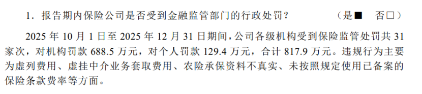 太平洋产险处罚同样较为集中,据太保产险2025年各季度偿付能力报告披露,2025年全年公司各级机构累计受到保险监管处罚70家次,其中机构被罚款合计2433.8万元,个人被罚款合计507.7万元,全年被处罚总金额达2941.5万元。