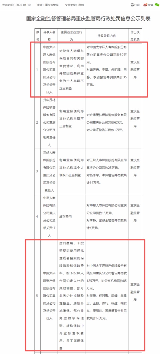 2026年以来,中国太保前期合规整改成效尚不明显,违规处罚态势仍未扭转,甚至出现寿险、财险同日同地双双被罚的案例。4月10日,太平洋人寿重庆分公司、太平洋财险重庆分公司因多项违规行为,在同一天被监管一并开出罚单,两家机构合计被罚金额达360万元。