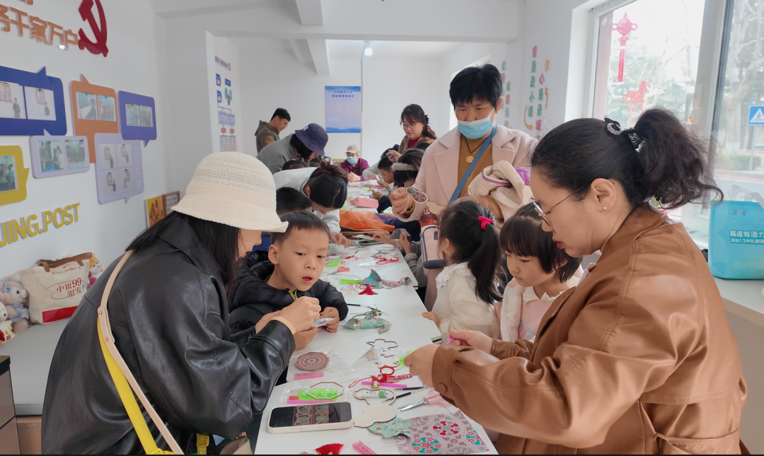 理论分享结束后,非遗宋锦风铃DIY环节温情开启,孩子们专注投入、动手实践,家长们俯身陪伴、耐心协助,大家一起穿针引线、拼接面料、组装风铃部件,在默契协作中感受非遗文化的独特魅力,在欢声笑语中拉近亲子距离。活动尾声,一个个精致美观的宋锦风铃顺利完成,家长与孩子手持作品合影留念,定格下专属的温馨美好瞬间。
