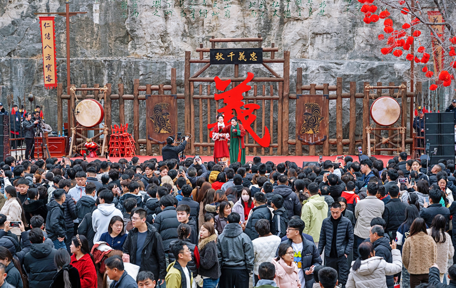 这一天,开封万岁山的“顶流”——“王婆”带着她的相亲台空降梁山。消息一出,周边城市的游客蜂拥而至,景区入口排起了长龙,摩崖石刻广场被围得水泄不通。当地居民忍不住感慨,“从没见过梁山有这么多人!”