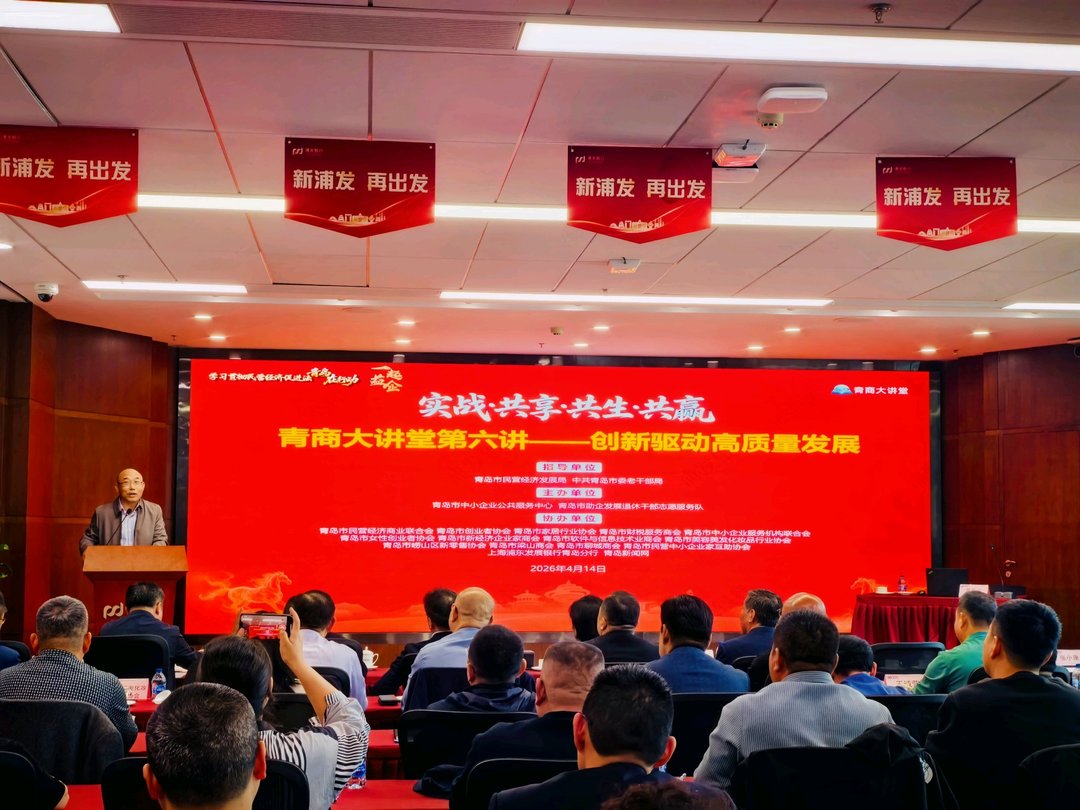 2026年4月14日下午,第六期“青商大讲堂”专题活动成功举办。本次活动以“创新驱动高质量发展”为主题,由青岛市民营经济发展局、中共青岛市委老干部局指导,青岛市中小企业公共服务中心、青岛市助企发展退休干部志愿服务队、青岛市民营经济商业联合会联合主办,上海浦东发展银行青岛分行协办。青岛市民营经济发展局副局级领导干部史凤隆主持活动并致辞,中共青岛市委老干部局副局长吕丽艳出席活动。青岛啤酒集团原党委书记、董事长、青岛市助企发展退休干部志愿服务队队长黄克兴应邀作主题分享,来自全市各行业龙头骨干企业、专精特新“小巨人”企业、瞪羚企业的董事长、总经理等核心高层管理人员170余人参会,参会企业层级、规模创系列活动新高。