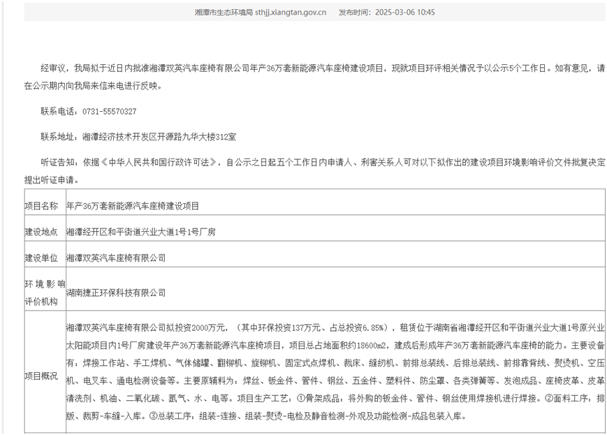 而经济导报记者发现,据湘潭市生态环境局2025年3月6日发布的《湘潭双英汽车座椅有限公司年产36万套新能源汽车座椅建设项目环境影响评价拟审批公示》显示,湘潭双英汽车座椅有限公司拟投资2000万元,(其中环保投资137万元、占总投资6.85%),租赁位于湖南省湘潭经开区和平街道兴业大道1号原兴业太阳能项目内1号厂房建设年产36万套新能源汽车座椅项目,项目总占地面积约18600m2,建成后形成年产36万套新能源汽车座椅的能力。