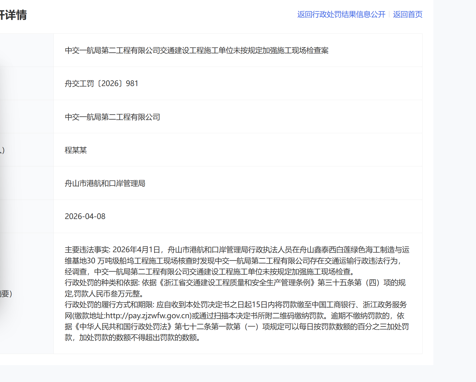 4月8日,浙江省行政处罚结果信息显示,因交通建设工程施工单位未按规定加强施工现场检查,中交一航局第二工程有限公司被舟山市执法部门依法罚款3万元。