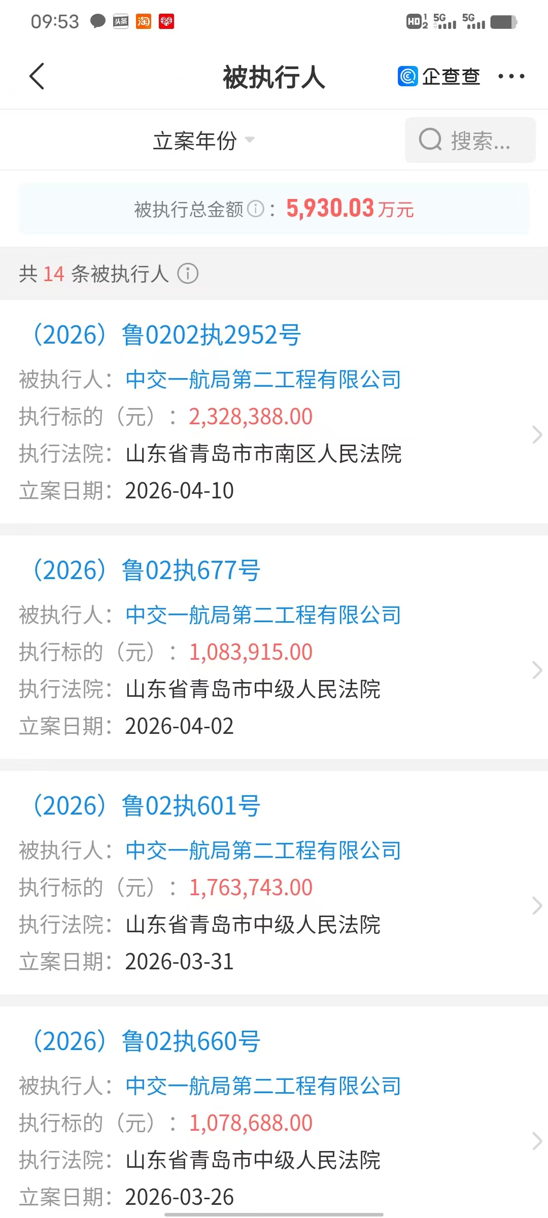中交一航局第二工程有限公司因违法被罚!此前3个多月新增14条被执行信息,涉及金额近6000万