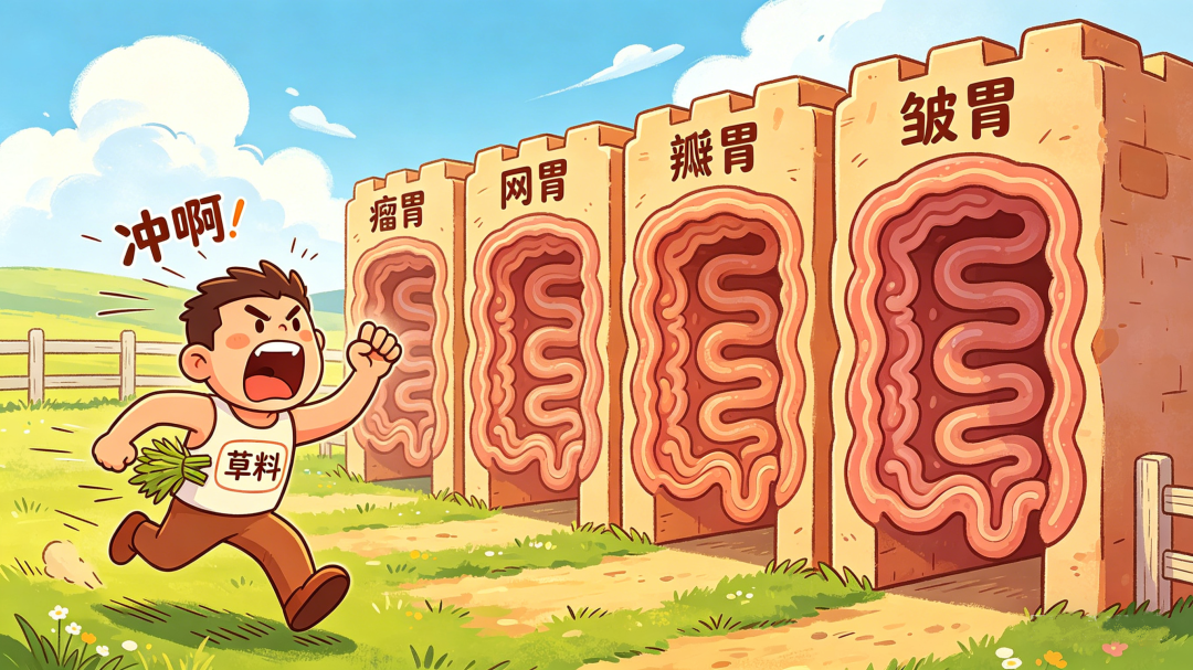 而反刍则由和瘤胃相连的网胃触发,当粗糙的草料进入网胃,就会刺激网胃内壁收缩,从而引发反刍。