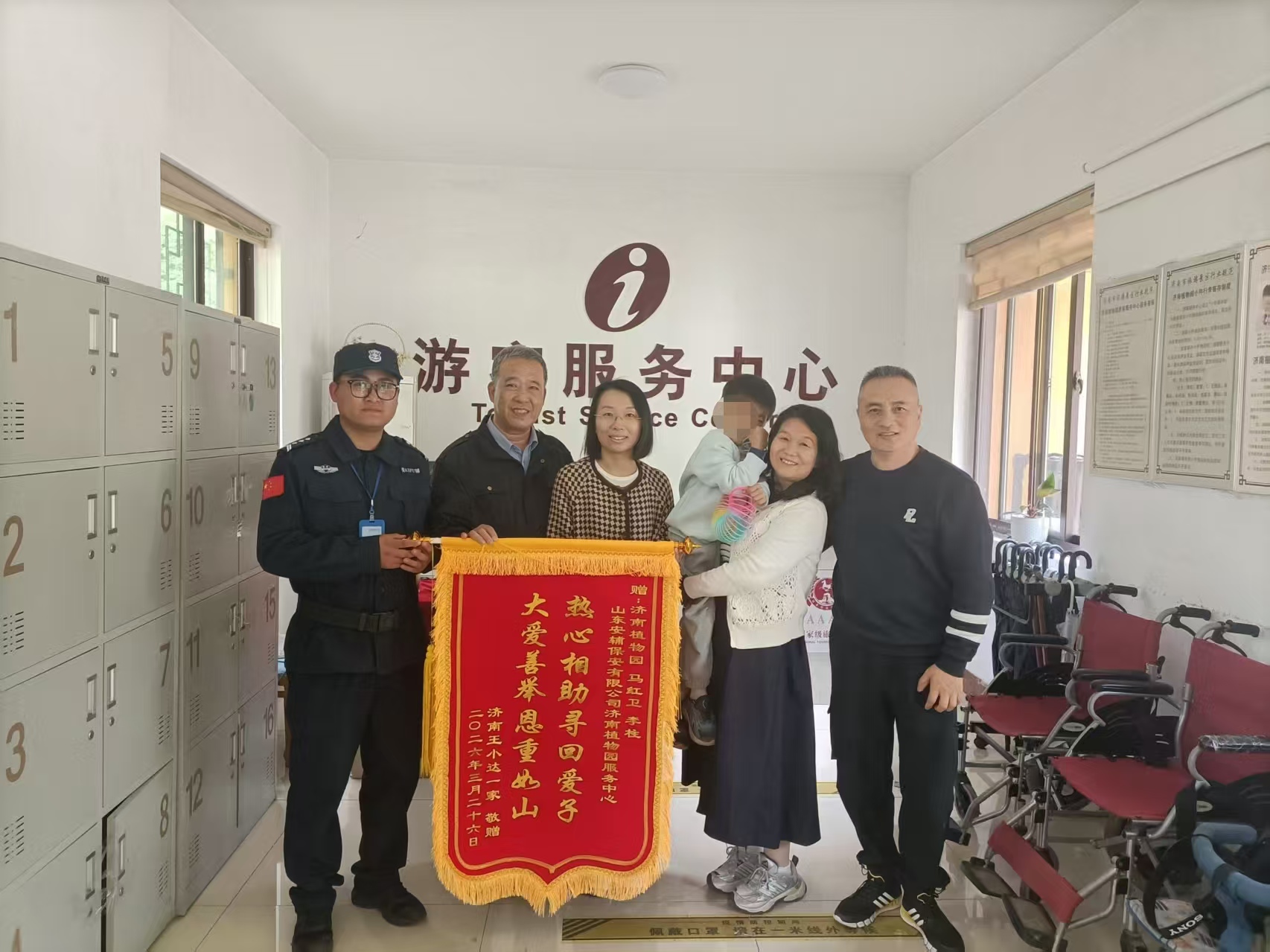 经过近一个小时的排查,保安人员终于在园区大路边发现孩子。看到孩子平安无恙,王先生夫妇激动不已,并连声感谢。几天后,他们特意将锦旗专程送到济南植物园物业服务中心,向参与搜寻的保安人员表达诚挚谢意。