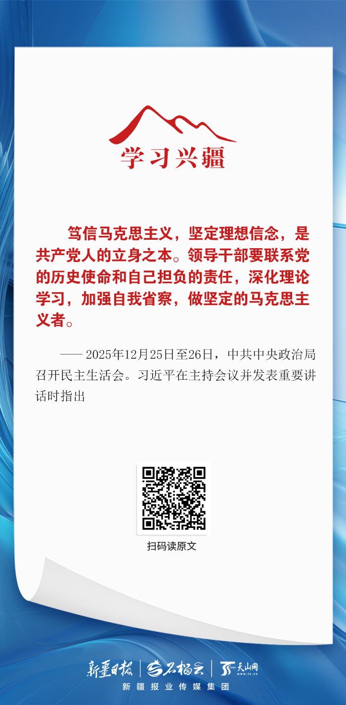 笃信马克思主义,坚定理想信念,是共产党人的立身之本。领导干部要联系党的历史使命和自己担负的责任,深化理论学习,加强自我省察,做坚定的马克思主义者。——2025年12月25日至26日,中共中央政治局召开民主生活会。习近平在主持会议并发表重要讲话时指出