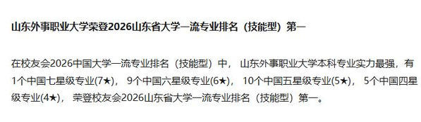 山东外事职业大学荣登“校友会2026山东省大学一流专业排名(技能型)”榜榜首