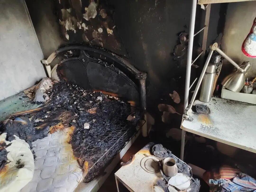床头柜、床、枕头等物品也被烧黑
