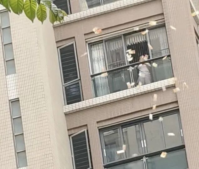 星湖城小区有人朝窗外抛撒港币。网传视频截图