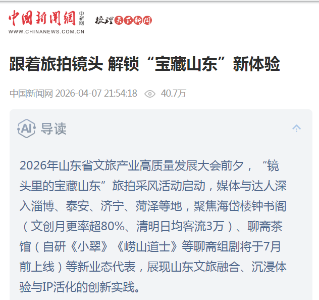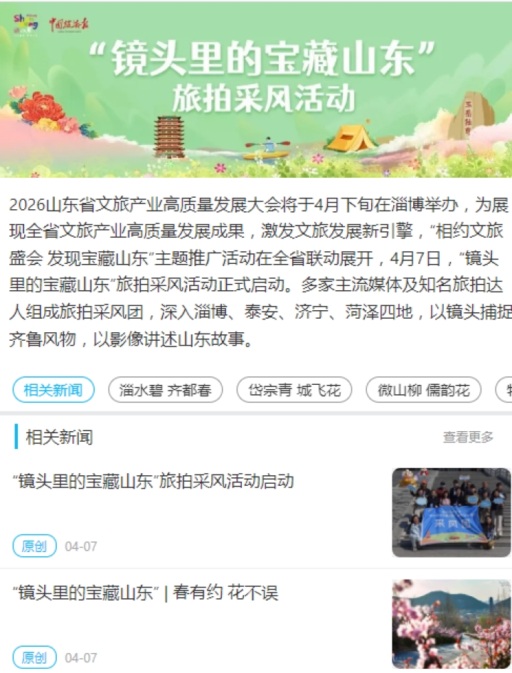 走进淄博感受千年匠心与城市烟火;探访泰安品读泰山文化与中华文明;漫步济宁领略运河水乡与生态之美;打卡菏泽定格国色天香与非遗技艺的精彩瞬间……近日,“镜头里的宝藏山东”旅拍采风活动举办。活动期间,采风团从济南出发,深入淄博、泰安、济宁、菏泽4地,以春日视角与赏花经济为切入点,聚焦各地特色资源与沉浸式体验,通过多种方式呈现“宝藏山东”的自然之美、人文之韵与城市之魅。