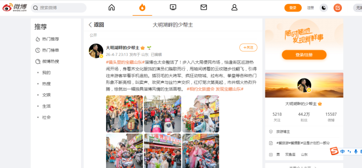 人民网、光明日报、中国旅游报、大众日报、山东电视台、新黄河等媒体对活动进行宣发报道,累计发布稿件80余篇;自媒体平台发布话题笔记、游记、微博、短视频等内容120余条,#镜头里的宝藏山东#话题登上微博热搜榜,有效提升“宝藏山东”的认知度,以镜头为媒,为文旅高质量发展赋能。