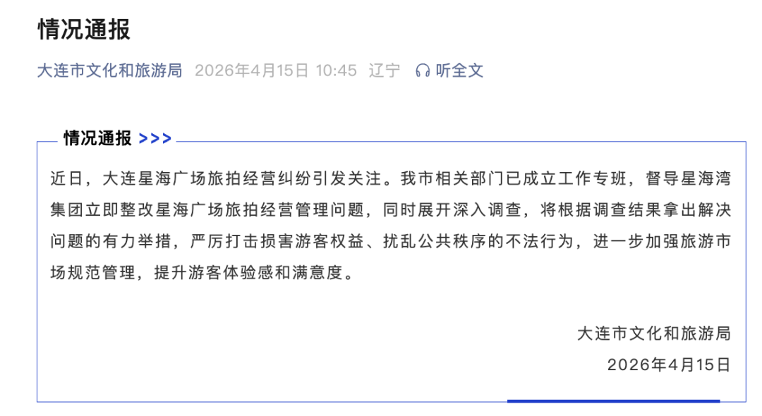4月15日,大连市文化和旅游局发布“情况通报”称,大连市相关部门已成立工作专班,督导星海湾集团立即整改星海广场旅拍经营管理问题,同时展开深入调查,将根据调查结果拿出解决问题的有力举措,严厉打击损害游客权益、扰乱公共秩序的不法行为,进一步加强旅游市场规范管理,提升游客体验感和满意度。