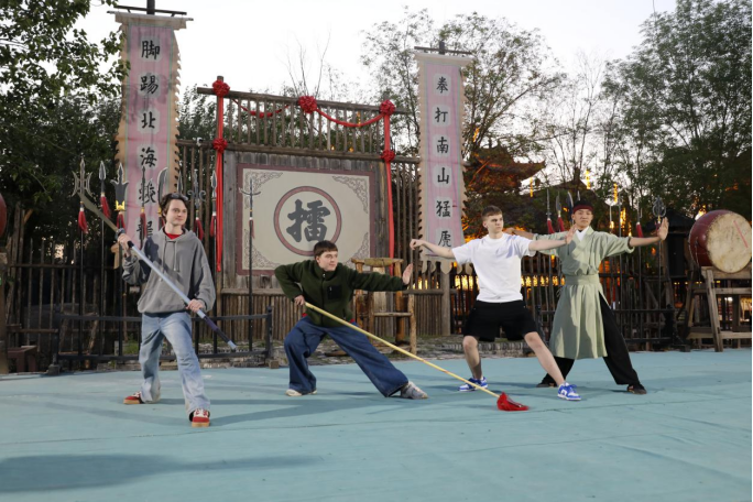 武术体验环节,将气氛推向高潮。在“燕青打擂”表演舞台上,表演者拳风凌厉、招式刚劲,一招一式虎虎生风,精彩的水浒武术展演赢得台下阵阵掌声与喝彩。演出刚落幕,饰演“燕青”的演员便被青少年们团团围住,大家个个跃跃欲试,纷纷拿起大刀、长枪等兵器认真比划,在专业指导下学习水浒拳。俄罗斯少年Kolesnikov Lev首次接触中国武术,招式虽略显生涩,但学习态度格外专注。他由衷感叹:“有力量!第一次体验中国功夫,今天自己也能打上几招,我很开心。”