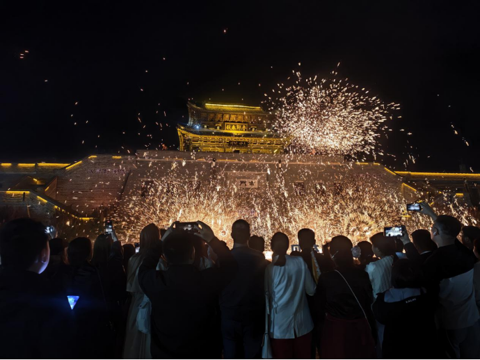 除此之外,大家还与景区NPC互动游戏、赚取“银票”兑换礼品,学说郓城方言、体验快板节奏,全程欢声笑语不断。夜幕降临,非遗绝技打铁花表演震撼登场,1600多度高温的铁水被奋力击打腾空,化作漫天璀璨金雨,火树银花、流光溢彩,在一声声“乌拉”的欢呼声中,这份传承千年的视觉盛宴无需语言翻译,直击人心。