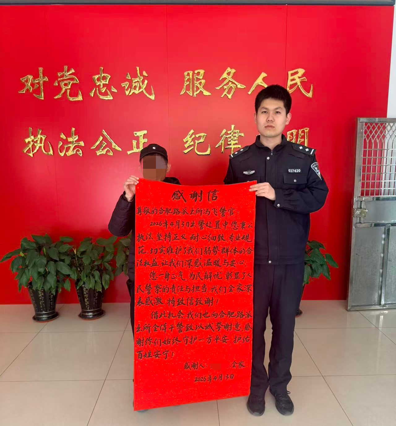 处警结束后,民警将处理结果告知了远在外地的报警人王先生。王先生对公安机关快速出警,妥善处置的工作态度表示满意,并于4月13日上午专程赶到合肥路派出所,为民警送来饱含真情的感谢信。