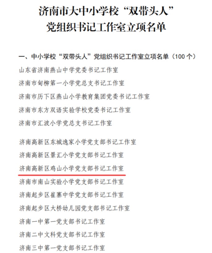 近日,中共济南市委教育工作委员会办公室公布全市大中小学校“双带头人”党组织书记工作室立项名单,济南高新区鸡山小学党支部书记工作室成功入选,获评全市中小学校“双带头人”党组织书记工作室立项单位。