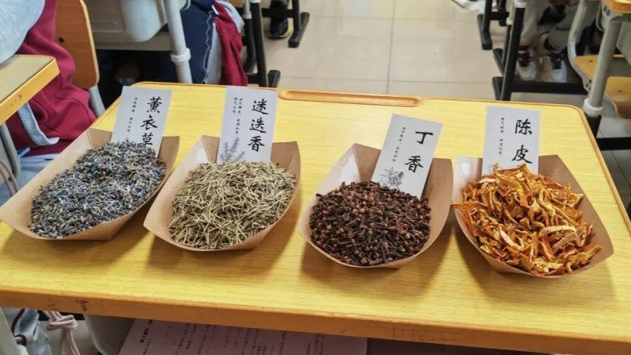 刘雪梅精心准备了艾叶、薄荷、丁香、陈皮等多种天然中药材,以及香囊布袋等制作工具,为同学们开启了一场有趣的中医药文化之旅。她结合图片和实物,介绍每一位中药材独特的功效——艾叶能驱寒驱蚊,薄荷能提神醒脑,丁香能清新口气。同时,她还讲解了香囊“祈福安康”的美好寓意,让同学们在了解文化的同时,感受传统民俗的温暖。