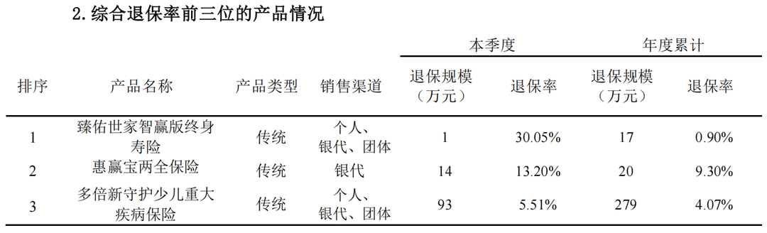新华保险仅上述三款产品2025年的累计退保规模合计就高达46.48亿元。此外,该公司另一款产品2025年第四季度的退保率超过30%,但当期退保规模仅为1万元,该产品名称为“臻佑世家”智赢版终身寿险,产品类型为传统险,销售渠道为个险、银保、团险渠道。