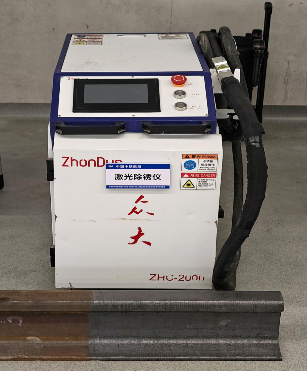 在钢轨除锈现场,施工人员使用的手持式激光清洗机,除锈过程中无粉尘、无污染,既不损伤钢轨,又保障了施工人员的健康,彻底改变了传统喷砂除锈“灰头土脸”的现状,得到一线施工人员的广泛认可。