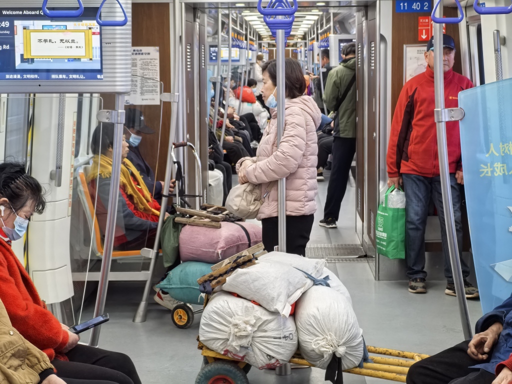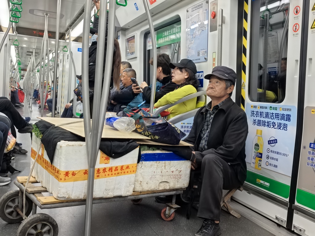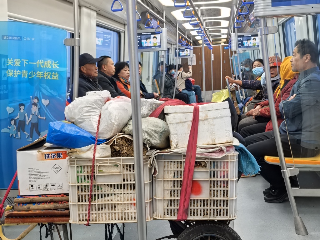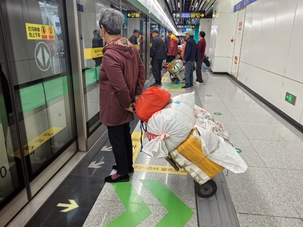 “上车以后,我们会将小车放在车门附近,但会尽量靠里一点,不能影响别人上下车,菜也都是用麻袋装好,别掉下来泥土啥的。”唐大爷说,地铁里这么干净,弄脏了也都不好意思,大家比较自觉。