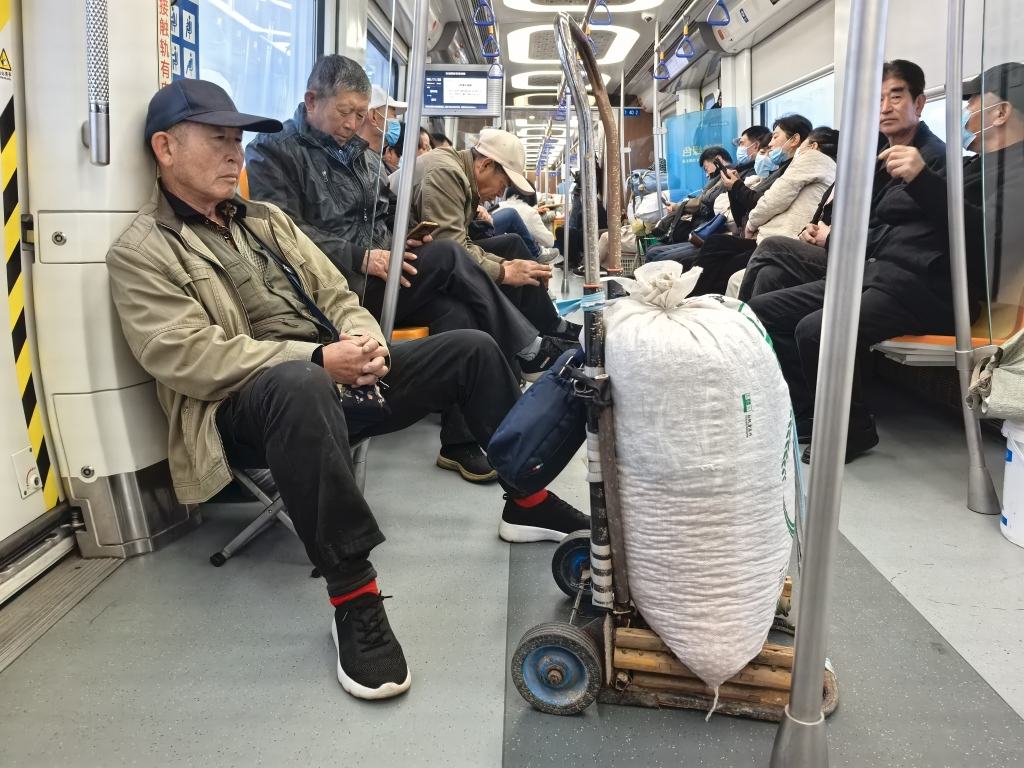 在这趟蓝谷快线上,赶大集的菜农只是乘客的一部分。更多时候,车厢里挤满了跨区上班族、环卫工人、农民工等等。有人把车停在地铁口换乘上班,有人自带马扎坐在过道里补补觉。