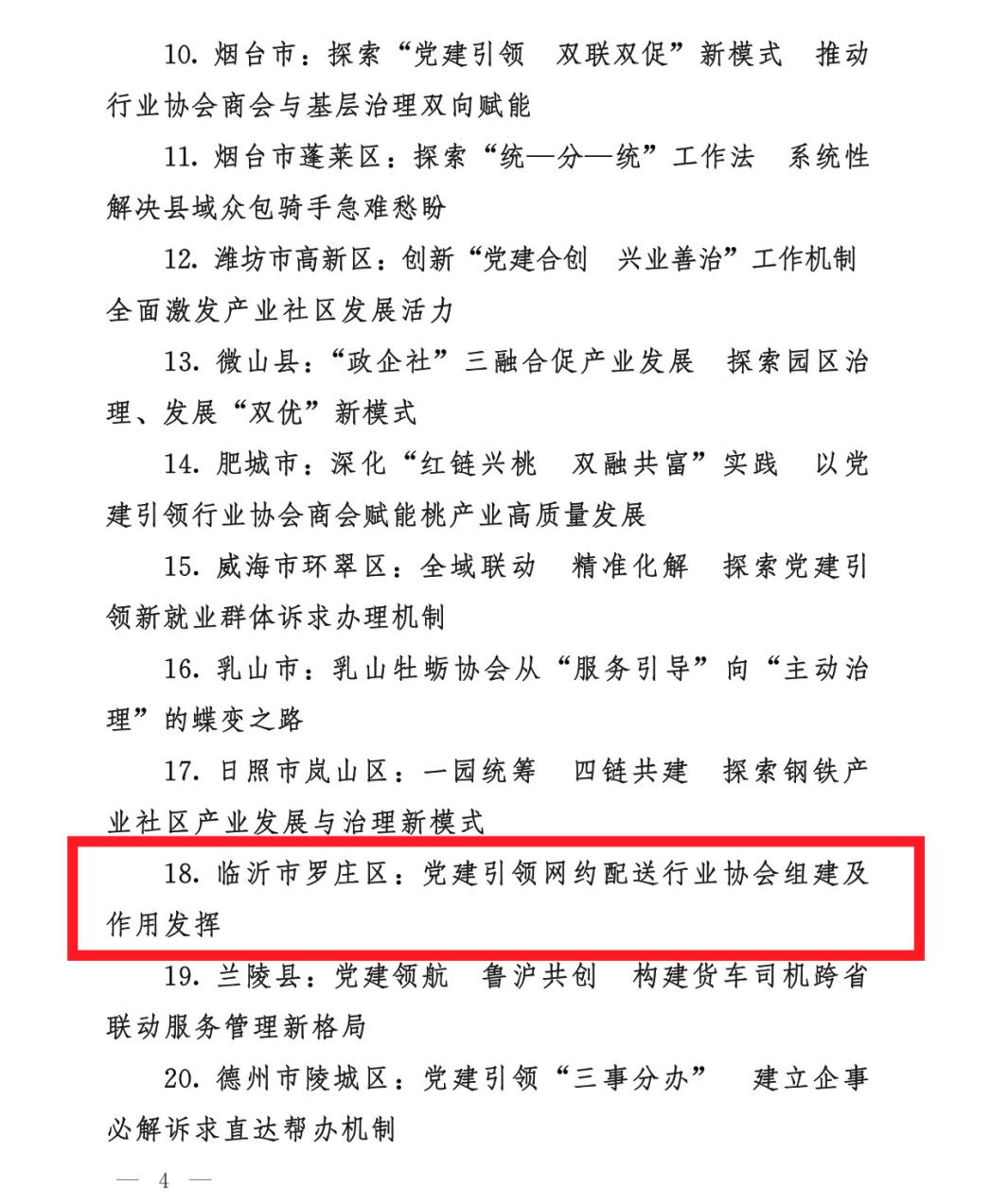 近日,山东省委社会工作部、省委“两新”工委公布了2026年度新兴领域党建“双融双创”创新试验区名单(全省25家单位),临沂市罗庄区以“党建引领网约配送行业协会组建及作用发挥”课题成功入选。