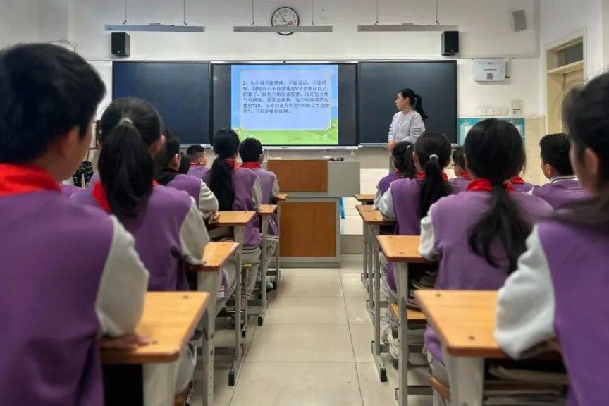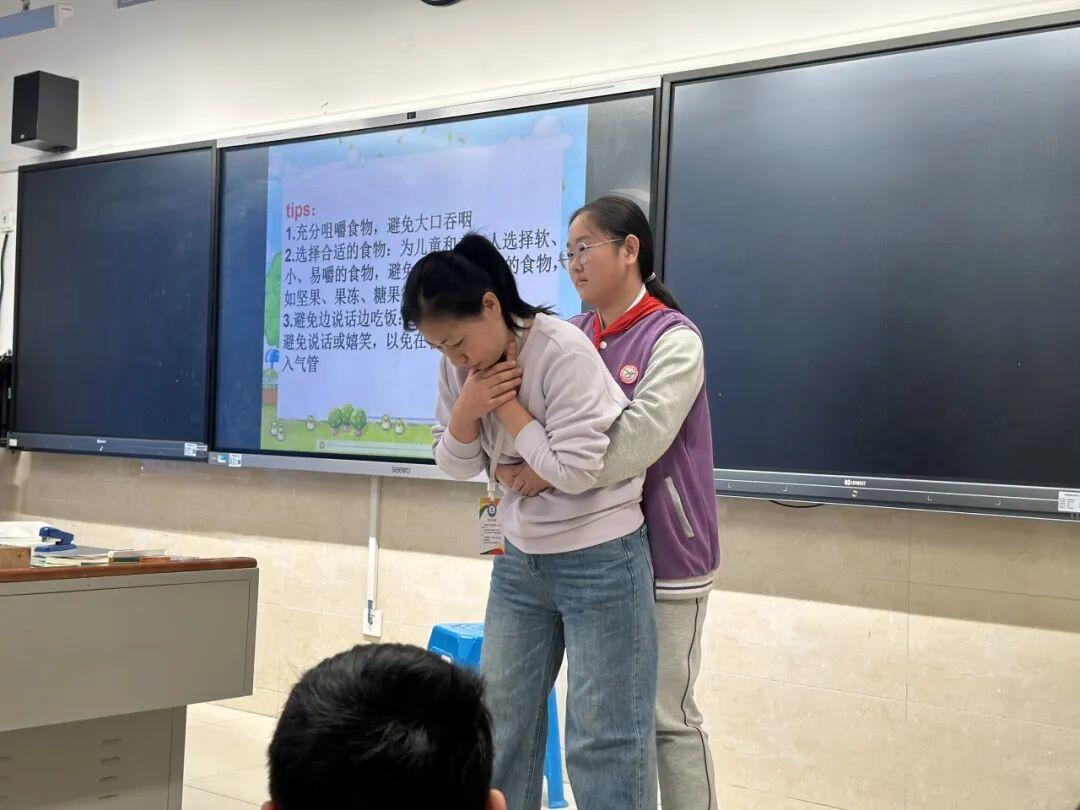 演示环节,赵逸芳瑄配合妈妈进行规范演示,一边解说一边展示施救站位、握拳位置及冲击力度,直观的展示让同学们快速掌握操作要领。活动最后,班主任陈晓彤总结发言,感谢岳燕的专业分享,希望同学们掌握急救技能并分享给家人,实现“一个学生带动一个家庭”的科普效果。