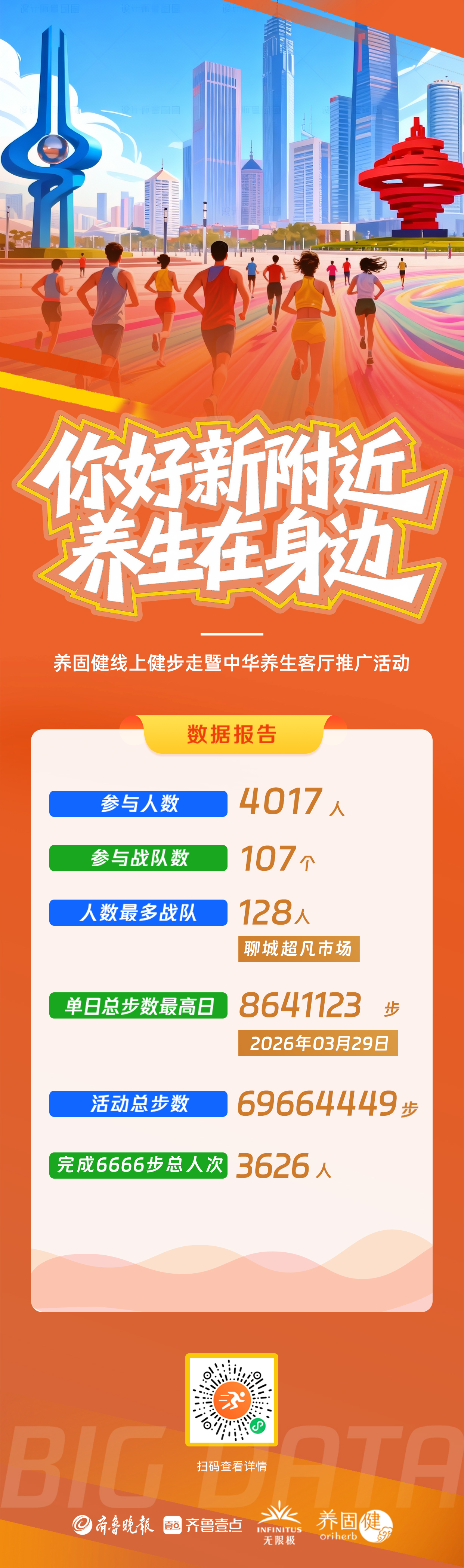 经过4天时间的组队,3月29日-4月6日,“你好新附近,养生在身边”线上健步走活动顺利举行。4017位参与者组成了107支战队。他们来自山东各个地市,以线上健步走活动为载体,推动中华养生文化走进社区,倡导科学养生、适度运动的健康生活方式。