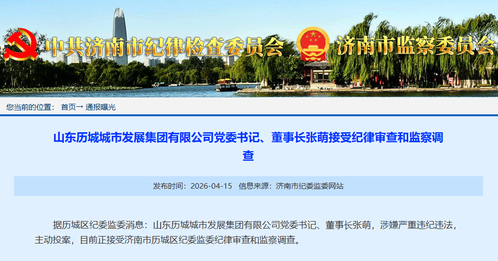 4月15日,据济南市历城区纪委监委消息:山东历城城市发展集团有限公司党委书记、董事长张萌,涉嫌严重违纪违法,主动投案,目前正接受济南市历城区纪委监委纪律审查和监察调查。