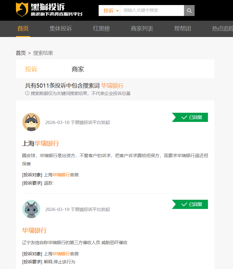 截至发稿,黑猫投诉平台关于华瑞银行的投诉量已突破5000条,其中多起投诉涉及该行通过携程金融等第三方平台放贷引发的暴力催收问题。