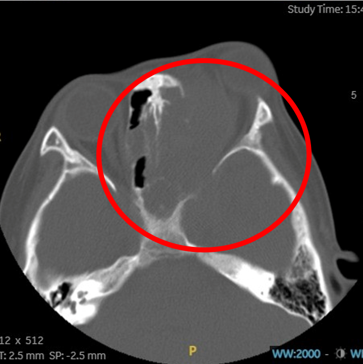 2023年底,青大附院西海岸院区儿童血液肿瘤科接诊了一名“特殊”的患儿,患儿左侧眼球突出明显,无法闭合,眼部周围组织糜烂肿胀,附有大量黄绿色分泌物,接下来的检查结果更让所有人倒吸一口凉气——影像学检查显示,患儿左侧筛窦、上颌窦、蝶窦、眼眶及鼻道内存在一巨大占位,大小约48mm×60mm×56mm的肿瘤,且已突破解剖屏障,向上侵入颅前中窝、海绵窦,向后包绕左侧颈内动脉,并严重压迫左侧视神经。病理活检最终明确为横纹肌肉瘤。