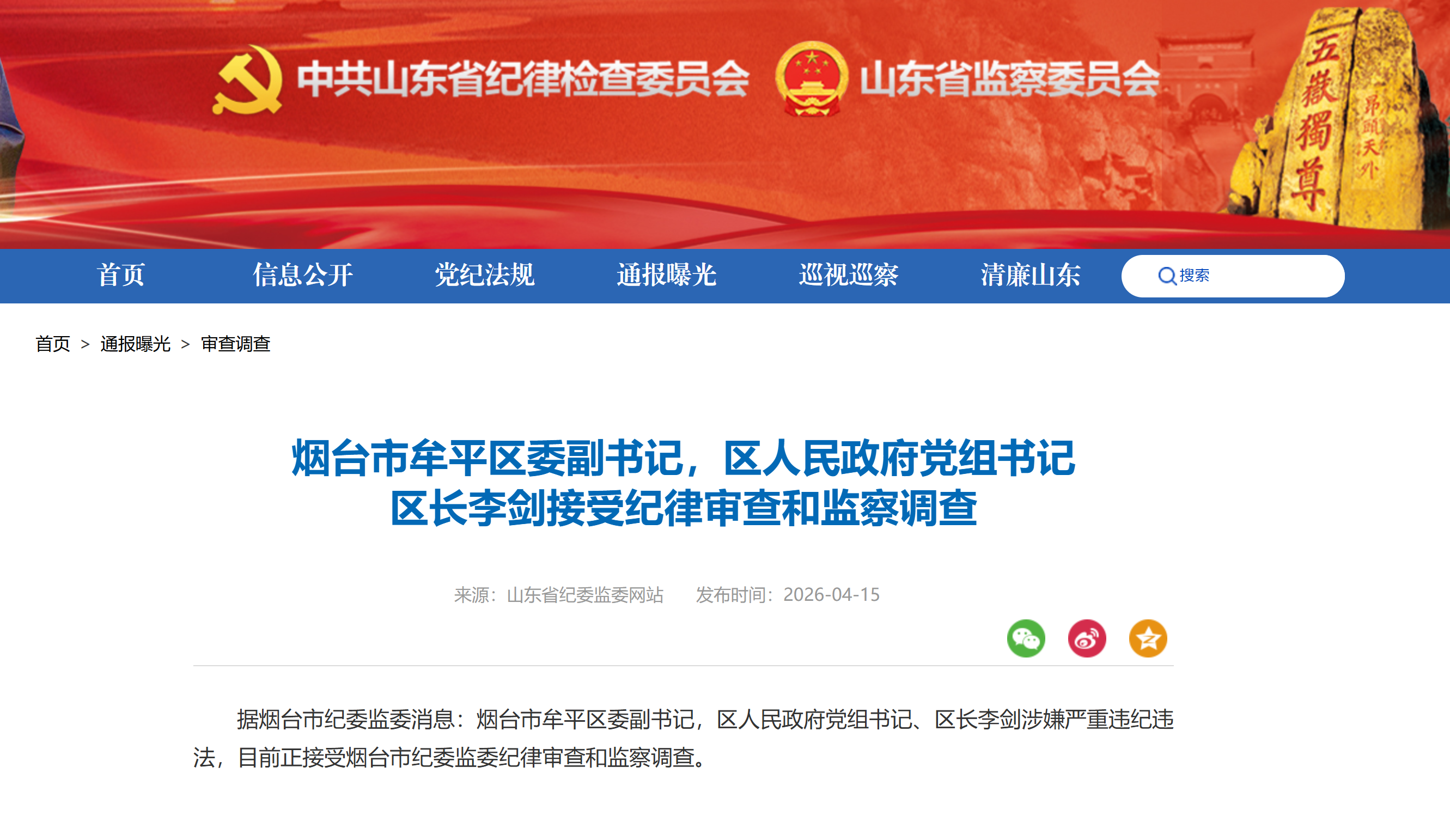 山东省纪委监委网站4月15日消息,烟台市牟平区委副书记,区人民政府党组书记、区长李剑涉嫌严重违纪违法,目前正接受烟台市纪委监委纪律审查和监察调查。