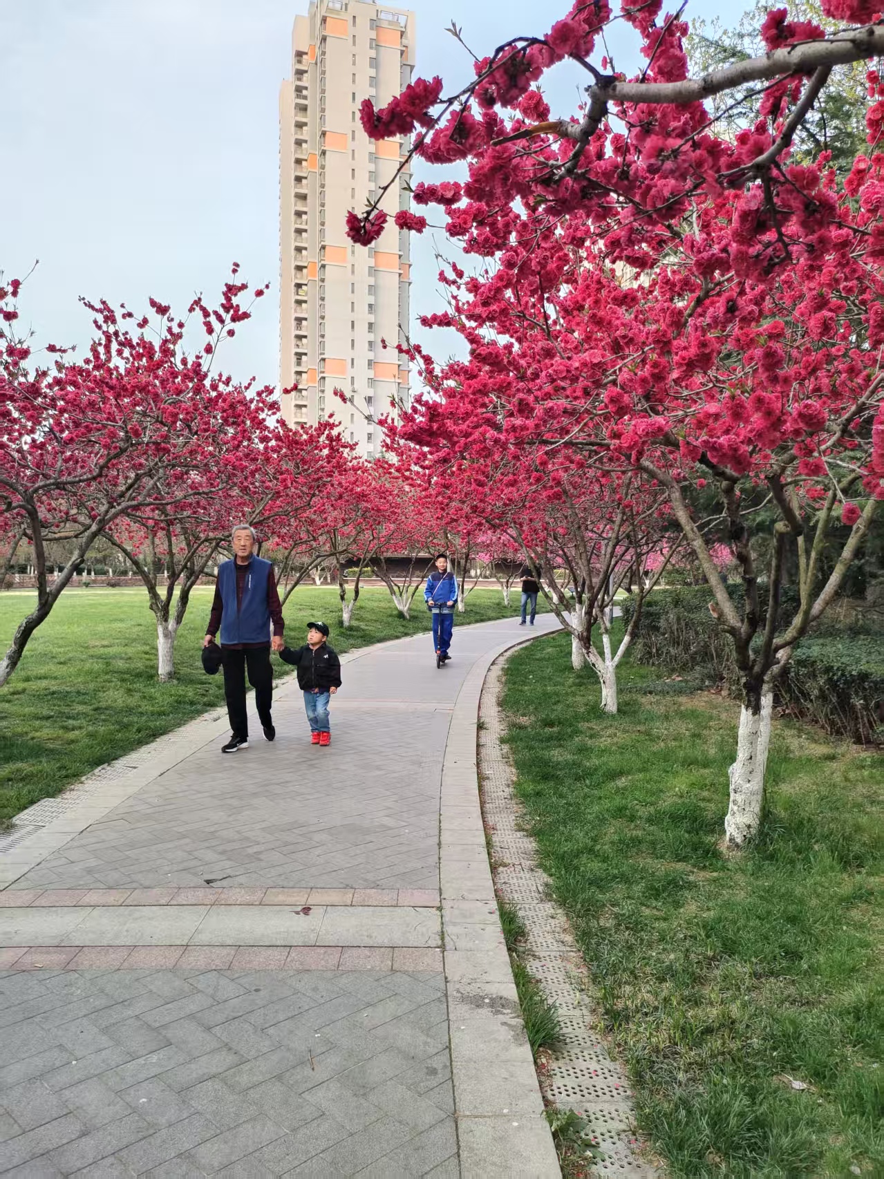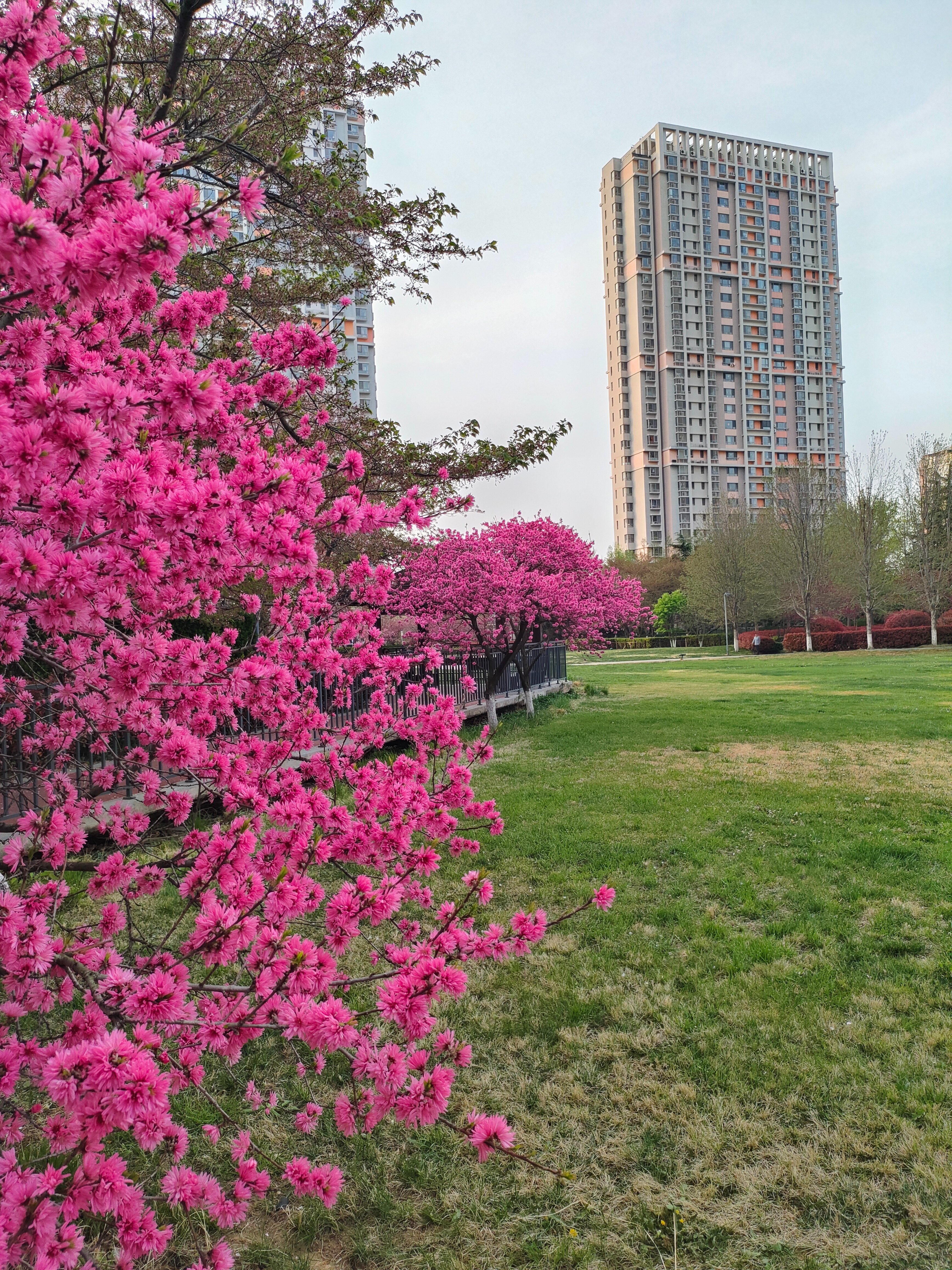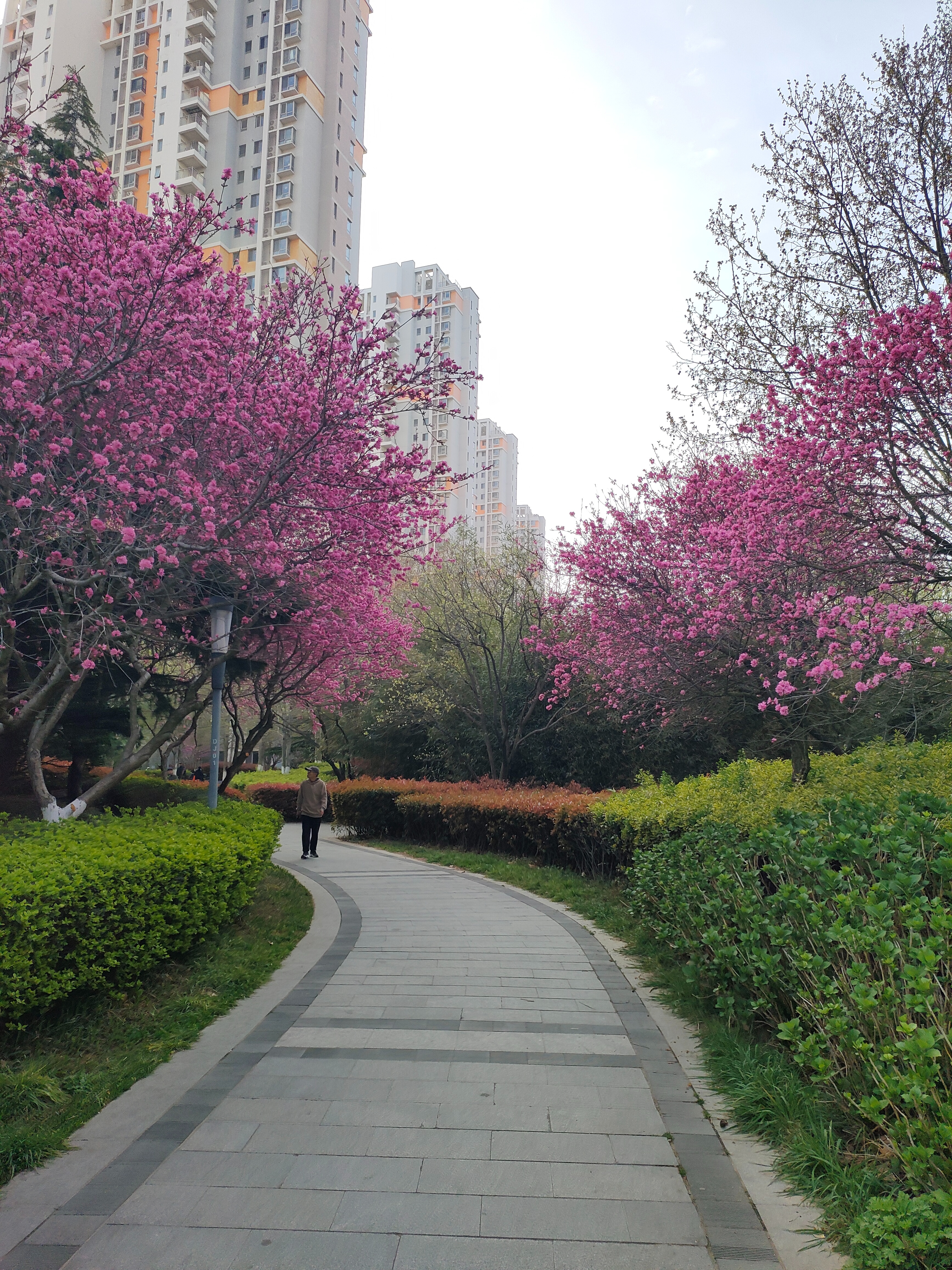 步入鲁信含章花园,仿佛闯入梦幻的春日秘境。染井吉野樱、关山樱绵延成浪漫花廊,粉白花瓣如云似霞,微风拂过,簌簌飘落的 “樱花雨” 唯美至极;玫红的碧桃热烈奔放、缀满枝头;洁白、淡紫的玉兰冰清玉洁、端庄高雅;搭配嫩黄的连翘、娇艳的海棠、清丽的紫荆,红、粉、白、紫、黄五色交织,层层叠叠、错落有致,将整个小区装点成五彩斑斓的童话世界。