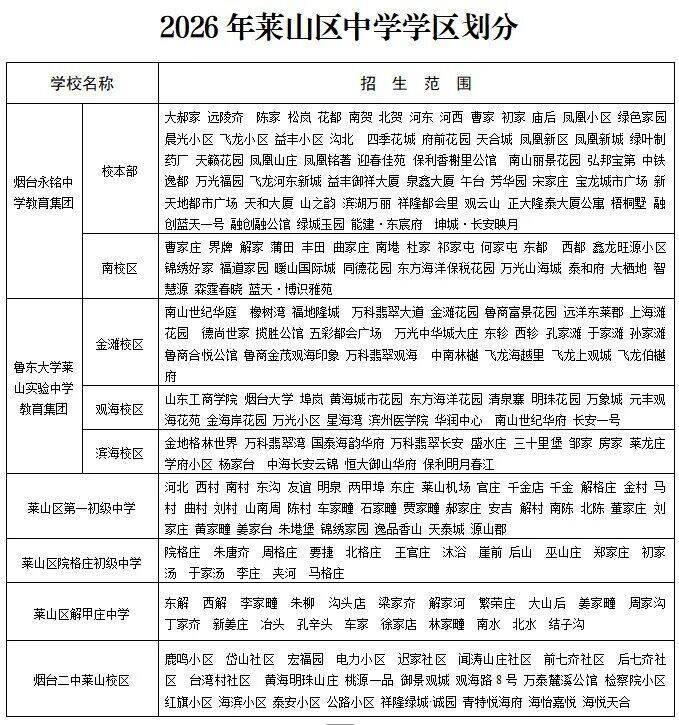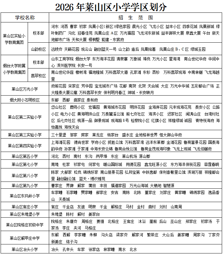 2026年,莱山区教育体育局继续遵照适龄新生免试、划区、就近入学(就近入学指的是相对就近,不是指绝对地理位置的远近)的原则,根据适龄儿童人数和分布状况、学校布局、学校规模、交通情况等因素,确定2026年莱山区义务教育阶段学校的学区范围。随着学校布局进一步优化,区教育体育局将继续适时对全区义务教育阶段学校的学区范围进行必要调整,确保义务教育免试就近入学全覆盖。