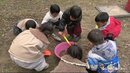户外场地上,老师提前准备了小铲子、小桶、清水。孩子们有的用小铲子挖取湿润的泥土,有的帮忙把泥土放进盆里加水搅拌,忙得热火朝天。不一会儿,一盆细腻的泥浆就准备好了。