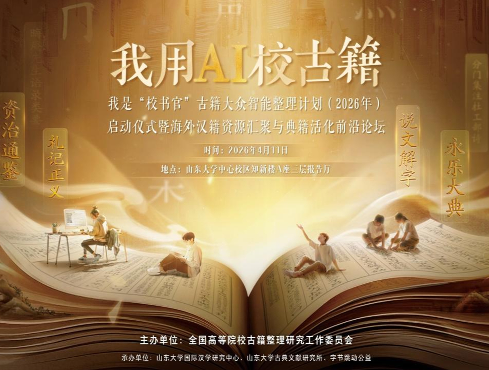 日前,我用AI校古籍——我是“校书官”古籍大众智能整理计划(2026年)启动仪式暨“汉籍合璧数字新境与典籍活化前沿论坛”在山东大学举行。活动由全国高等院校古籍整理研究工作委员会主办,山东大学国际汉学研究中心、山东大学古典文献研究所、《汉籍与汉学》编辑部、字节跳动公益联合承办,汇聚学界专家、技术代表、志愿者与文化创作者,共探数字时代古籍整理与文化活化新路径。
