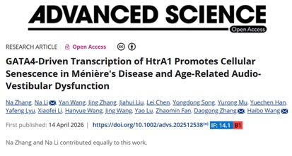 长期以来,梅尼埃病与老年听觉前庭功能减退的致病机制未被阐明。山东省第二人民医院眩晕疾病研究团队通过临床样本、动物模型及细胞实验验证,首次明确梅尼埃病患者前庭组织存在细胞衰老特征,表现为线粒体损伤、活性氧堆积、衰老相关分泌表型(SASP)因子大量释放。机制上,衰老状态下HDAC6表达下调,对GATA4的抑制作用减弱;入核的GATA4直接激活下游HtrA1转录,加速毛细胞损伤与前庭功能衰退。抑制HtrA1可显著改善模型小鼠听力与平衡功能,GATA4/HtrA1轴成为梅尼埃病与增龄性前庭功能障碍的全新治疗靶点。该成果系统解析“HDAC6‑GATA4‑HtrA1”内耳衰老调控轴,HtrA1抑制剂已有抗体药物进入临床开发阶段,有望推动内耳退行性疾病从“对症治疗”迈向“靶向衰老调控”新阶段。王海波教授、张道宫教授及李娜教授为本文的共同通讯作者,张娜博士后、李娜教授为本文第一作者。