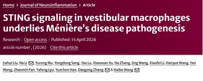 近日,山东省第二人民医院眩晕疾病研究团队王海波教授、张道宫教授及李娜教授两项重磅研究同日发表于国际权威期刊,分别在Advanced Science(IF=14.1)发表题为“GATA4‐Driven Transcription of HtrA1 Promotes Cellular Senescence in Ménière's Disease and Age‐Related Audio‐Vestibular Dysfunction”的研究论文,在Journal of Neuroinflammation(IF=10.1)发表题为“STING signaling in vestibular macrophages underlies Ménière’s disease pathogenesis”的研究论文,标志着团队在耳源性眩晕疾病发病机制及防治策略领域取得重大突破,充分展现了在临床与基础研究深度融合方面的科研实力。