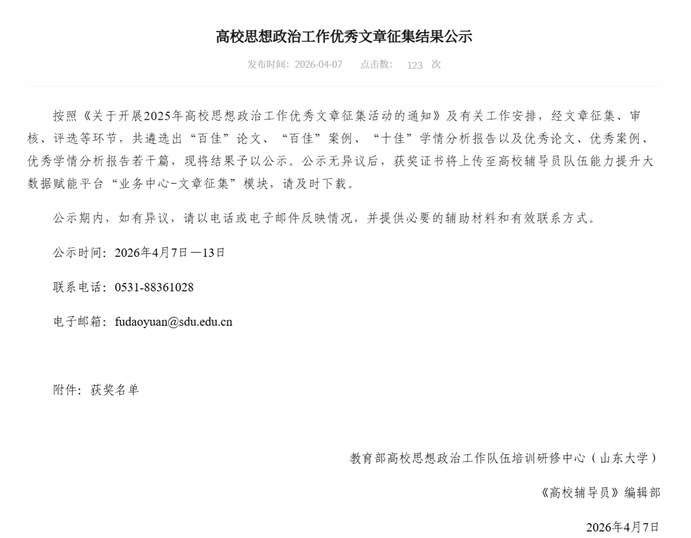 一直以来,学院坚守立德树人根本任务,持续加强辅导员队伍专业化、职业化建设,推动思想政治工作走深走实、系统提质。此次案例入选国家级百佳,既是对学院思政育人工作的高度认可,也是全院思政工作者深耕一线、潜心研究的成果体现。