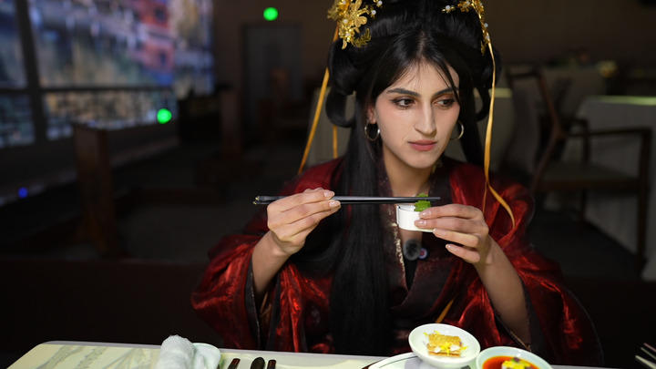 2026年2月12日,一名外国游客在上海外滩一家餐厅品尝中国美食。新华社记者 李海伟 摄