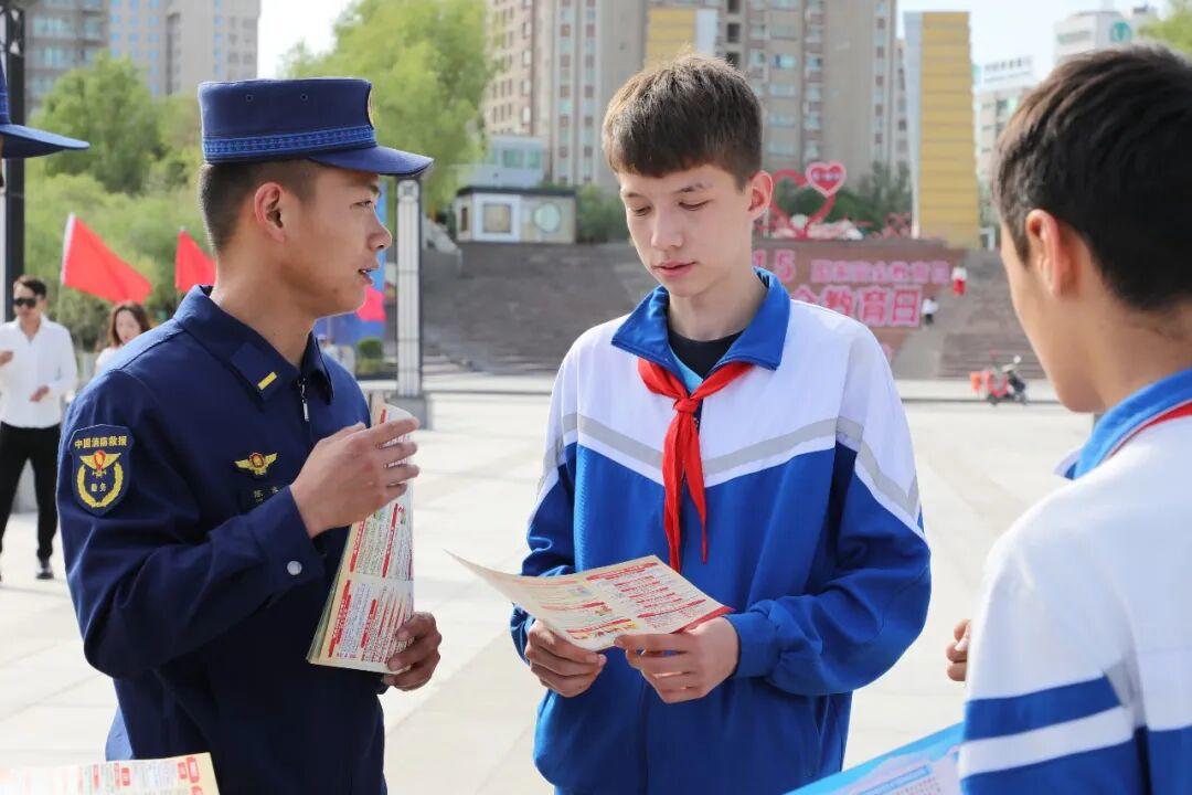 在喀什市东湖公园,消防宣传员在给学生普及消防知识。 喀什地区融媒体中心 实习记者尉旭升 摄