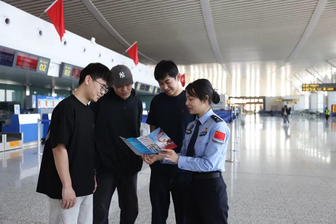 4月15日,喀什出入境边防检查站工作人员在喀什徕宁国际机场向旅客宣讲国家安全知识。喀什地区融媒体中心 记者余思民 摄