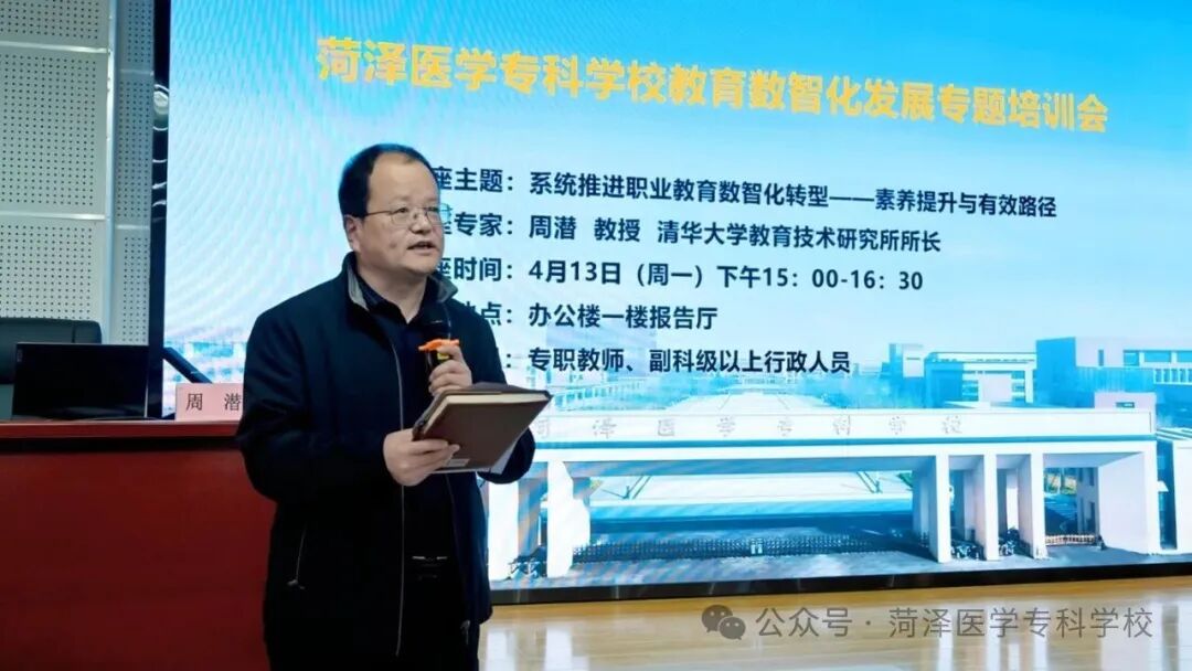 为深入贯彻落实教育数字化相关政策要求,切实推动职业教育数智化转型落地见效,4月13日,菏泽医专举办职业教育数智化发展专题培训会,特邀清华大学教育技术研究所所长周潜教授莅临指导并作《系统推进职业教育数智化转型——素养提升与有效路径》专题主旨报告。党委委员、副校长郭树榜主持会议,全校专职教师及副科级以上行政人员全程参与培训,凝聚数智化转型共识,夯实教育高质量发展根基。
