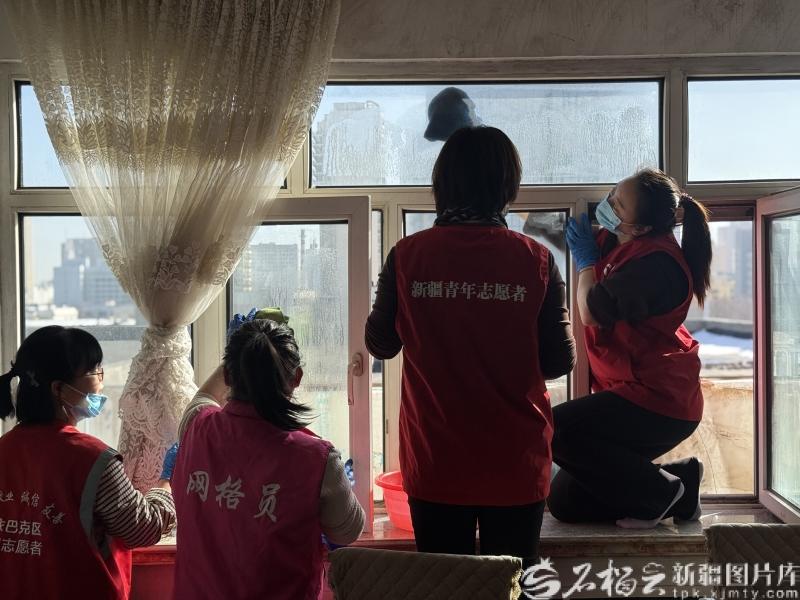 4月13日,在乌鲁木齐市沙依巴克区八一街道南昌北路社区居民阿不来提·塞依底家,志愿者们正在擦拭玻璃。石榴云/新疆日报记者 孙芳婷摄
